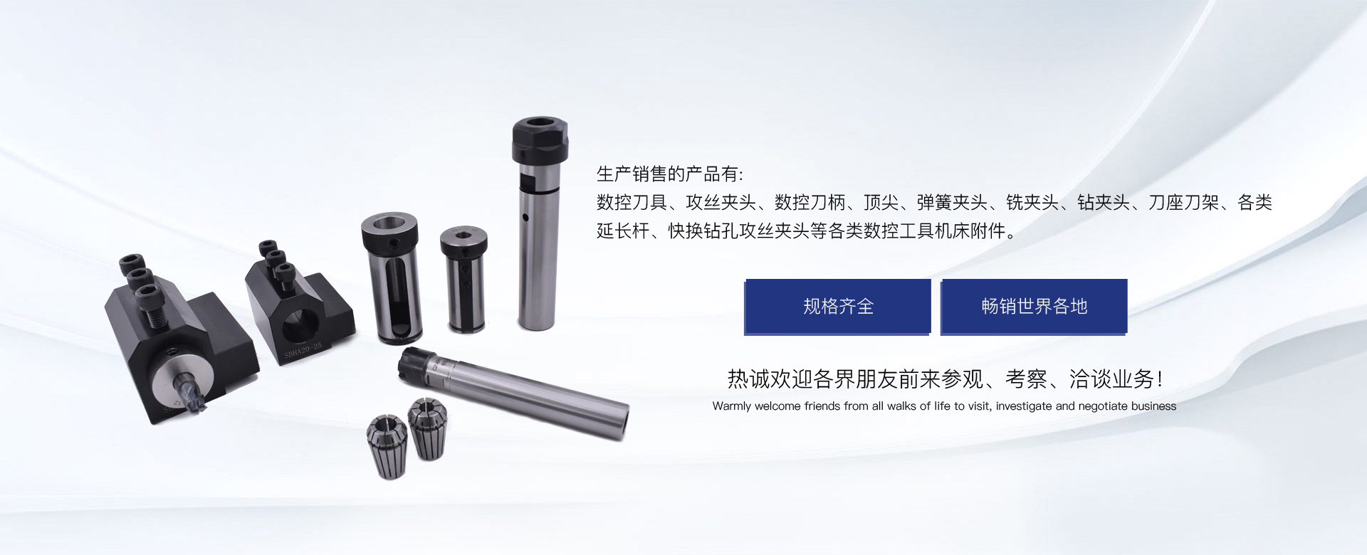 生產(chǎn)銷售的產(chǎn)品有:數(shù)控刀具、攻絲夾頭、數(shù)控刀柄、頂尖、彈簧夾頭、銑夾頭、鉆夾頭、刀座刀架、各類延長(zhǎng)桿、快換鉆孔攻絲夾頭等各類數(shù)控工具機(jī)床附件。